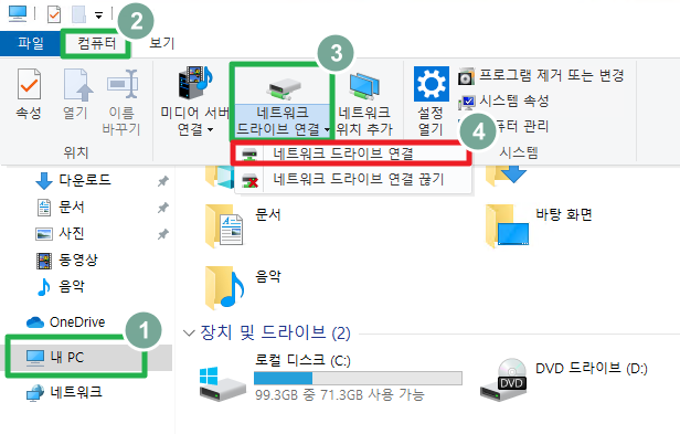 이후 상단의 컴퓨터 > 네트워크 드라이브 연결을 두 번 클릭합니다.