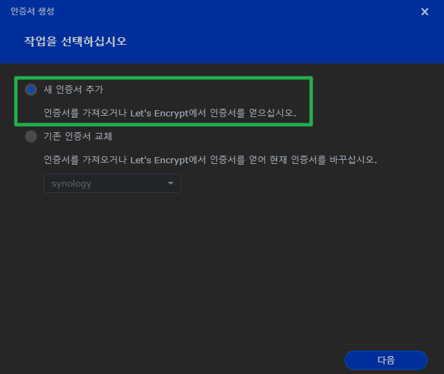 새 인증서 추가를 선택하고 다음을 클릭합니다.