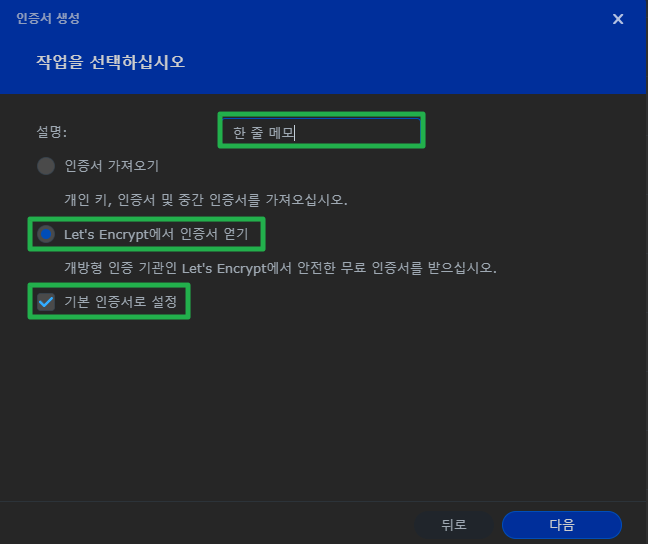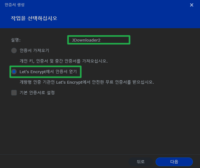 이후 Let’s Encrypt에서 인증서 얻기를 선택하고, 기본 인증서로 설정에 체크합니다.
