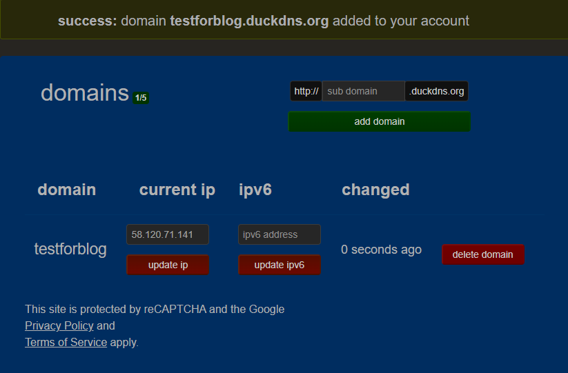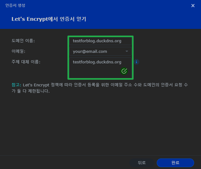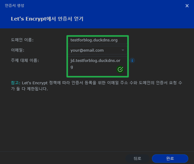 본 포스팅의 예시의 경우 jd.testforblog.duckdns.org,