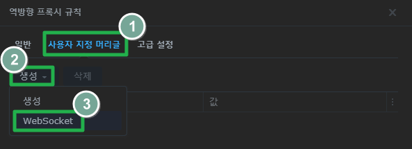 사용자 지정 머리글을 클릭하고, 생성 > WebSocket을 클릭합니다.