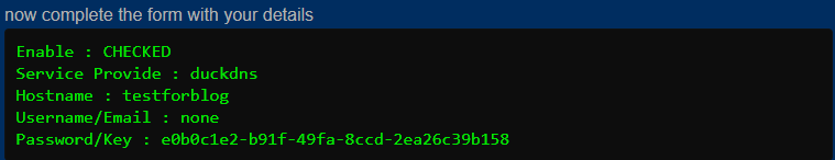 기입해야 할 정보는 Duck DNS 사이트에서 스크롤을 내려보면 찾을 수 있습니다.