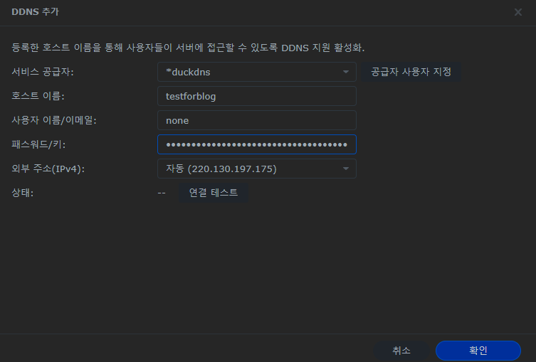 실제로 필자가 사용하는 주소의 경우 jd.noriarchive.duckdns.org 입니다.