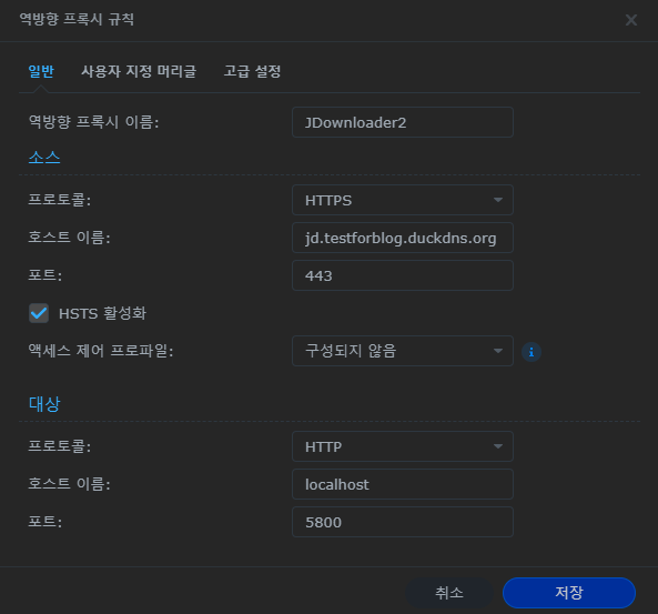 설명에 JDownloader2와 같이, 역방향 프록시를 걸 시스템의 이름을 기입합니다.