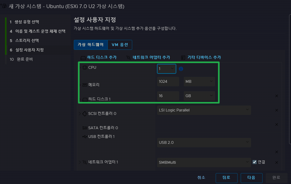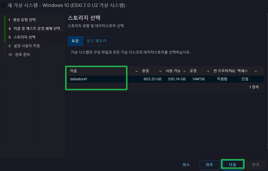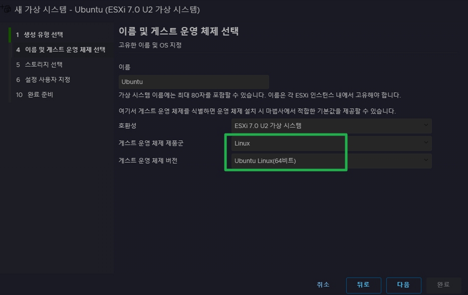 ESXi에 우분투가 설치될 위치를 지정합니다.
