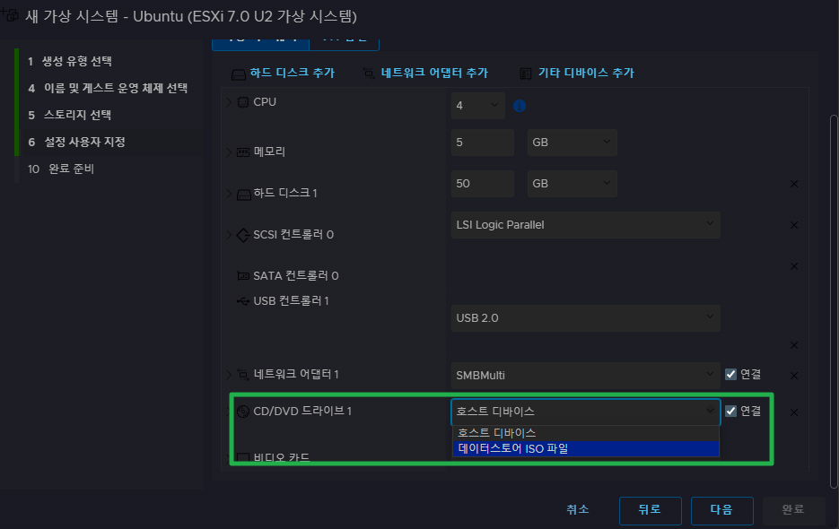 좀 전에 다운로드한 Ubuntu.iso를 탑재하기 위해 데이터스토어 ISO 파일을 선택합니다.