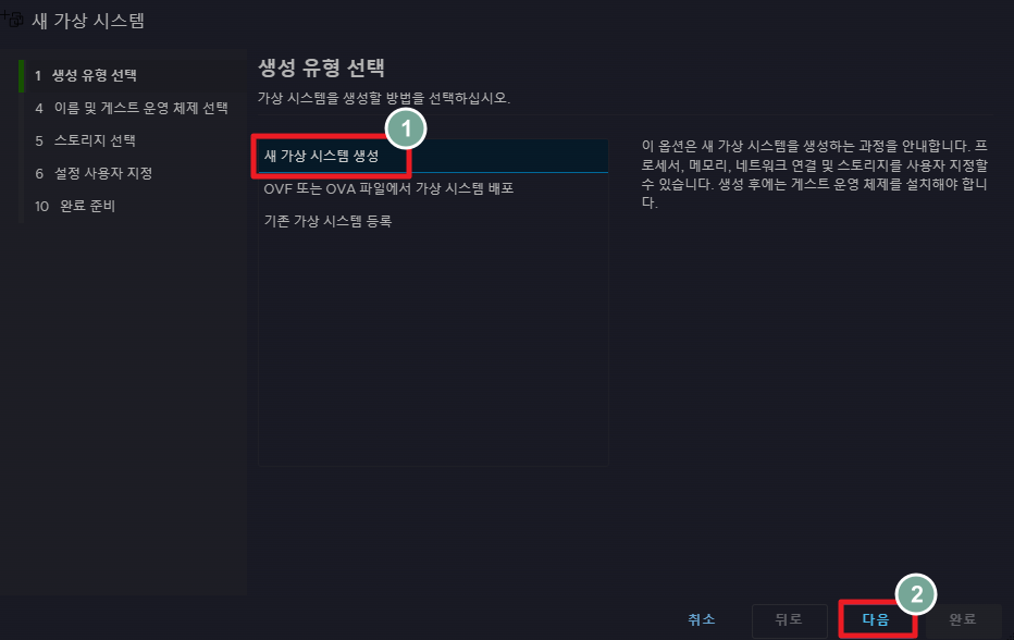 새 가상 시스템 생성을 지정하고, 다음을 클릭합니다.