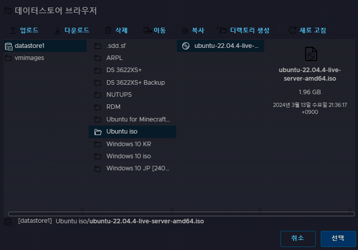 다운로드한 Ubuntu.iso 파일을 ESXi의 데이터스토어 브라우저를 통해 적당한 경로에 업로드합니다.