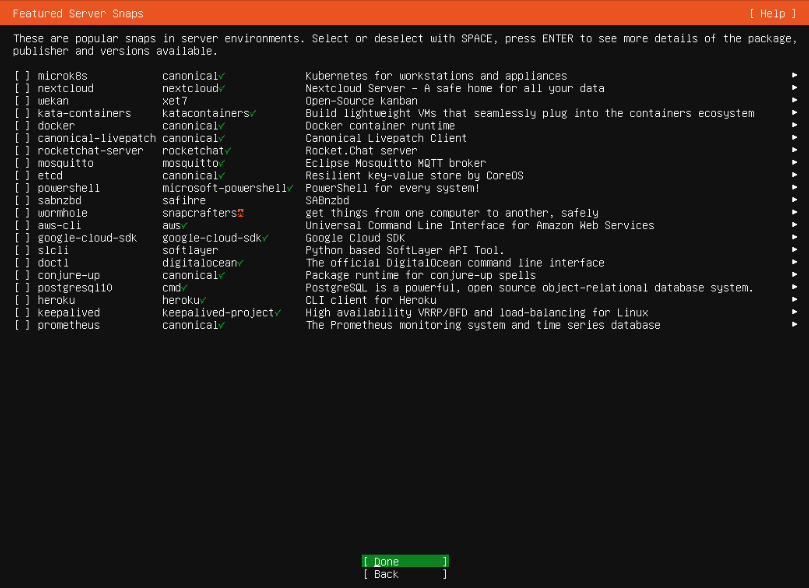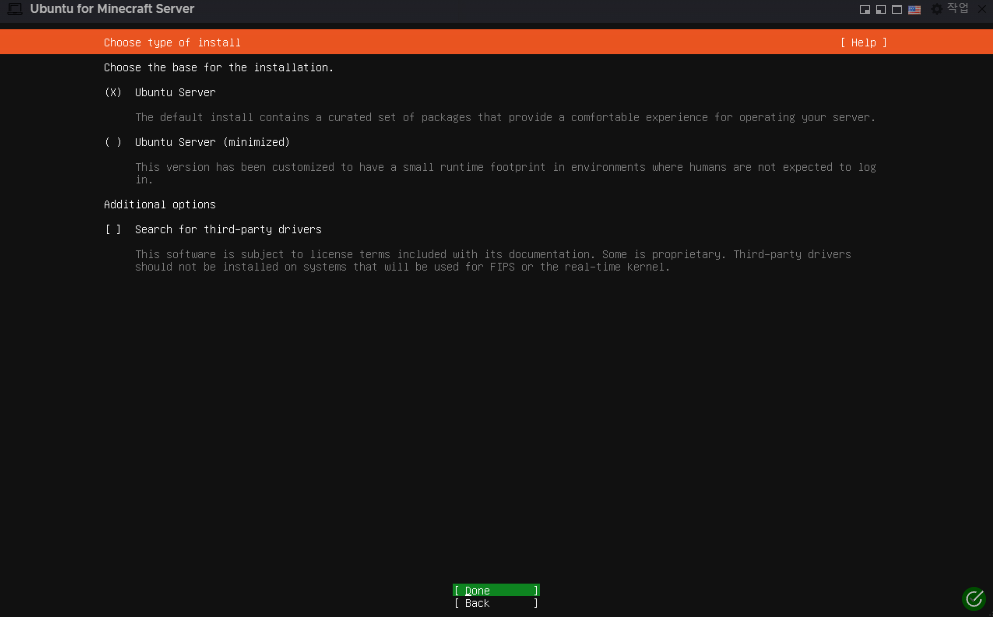 이 부분에선 제일 위의 Ubuntu Server에 체크하고, Done을 선택합니다.