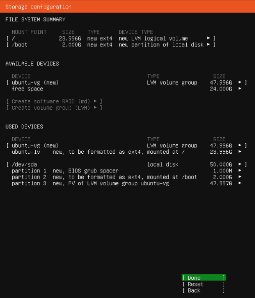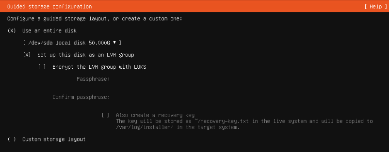 Custom storage layout 옵션은 사용자가 디스크 파티션을 수동으로 구성할 수 있습니다.