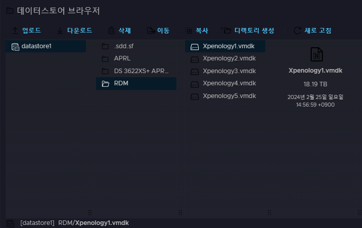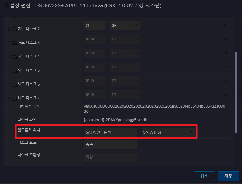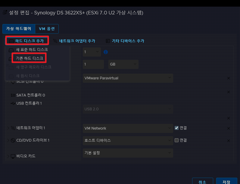 위와 같이 생성된 VMDK HDD를 XPEnology의 기존 하드 디스크에 추가합니다.