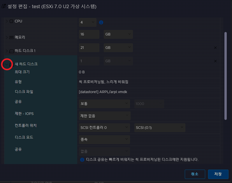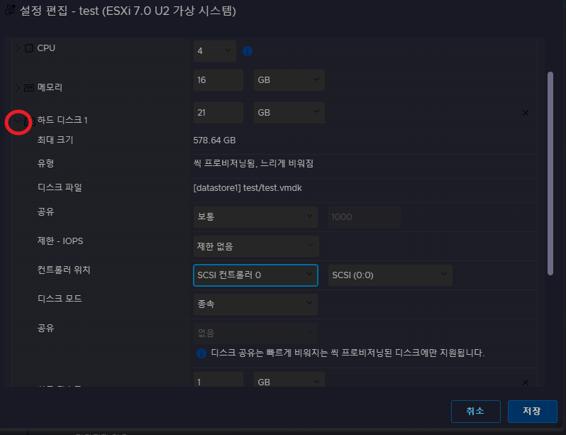 - 하드 디스크 1 (ESXi OS 영역의 더미) 21GB 이상.
