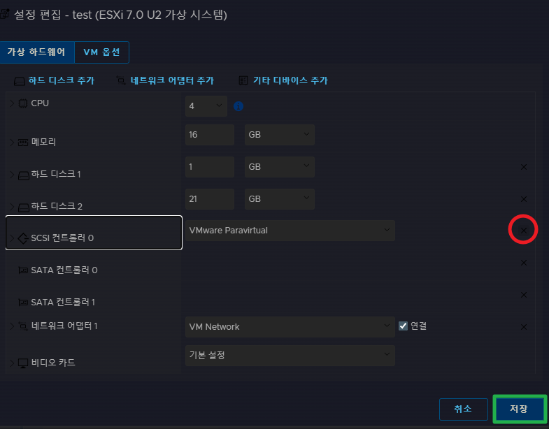 SCSI 컨트롤러 0을 오른쪽의 X 버튼을 클릭하여 제거하고 저장합니다.