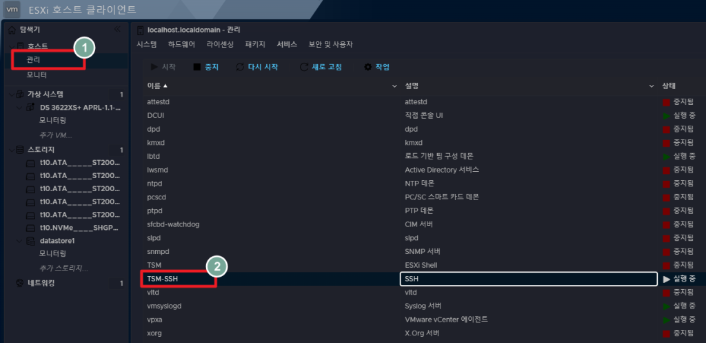 RDM을 생성하려면 SSH를 이용해야 하기에, ESXi > 관리 > 서비스 > SSH를 시작합니다.
